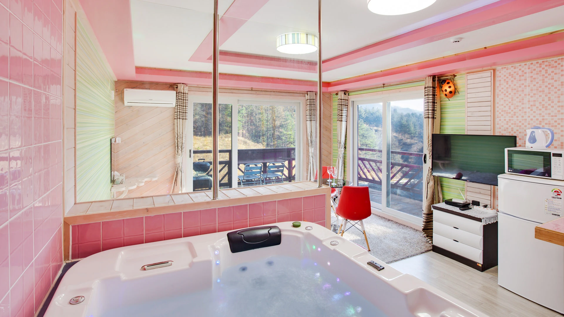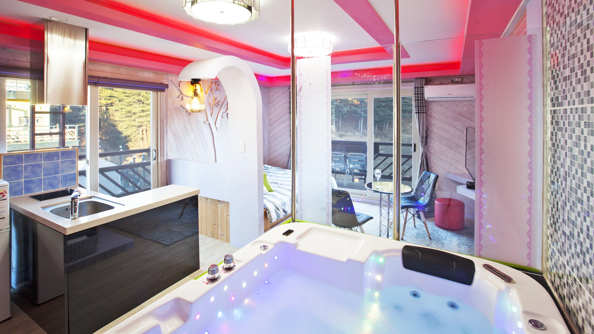 개성 있는 컬러와 특색 있는 테마로 깔끔하게 꾸며진 객실,